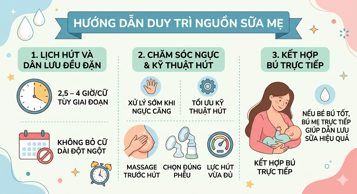 Khi ngực căng hoặc mẹ stress, phản xạ xuống sữa kém. Nếu cắm máy hút ngay, sữa ra ít và không hết.