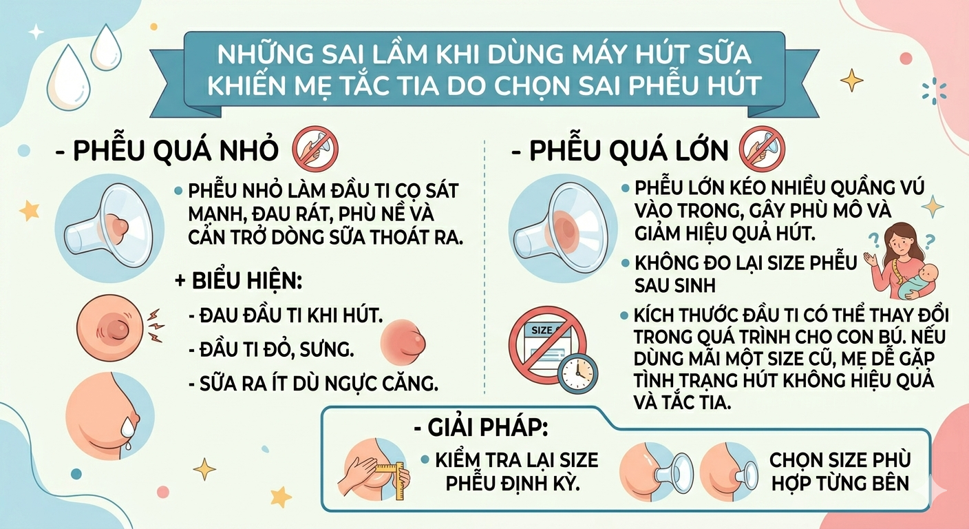 Những sai lầm khi dùng máy hút sữa khiến mẹ tắc tia là tình trạng rất nhiều mẹ sau sinh gặp phải, đặc biệt trong giai đoạn nuôi con bằng sữa mẹ nhưng chưa hiểu đúng cách sử dụng máy hút sữa. Máy hút sữa là công cụ hỗ trợ hiệu quả nếu dùng đúng kỹ thuật. Tuy nhiên, chỉ cần vài sai lầm nhỏ lặp lại mỗi ngày cũng có thể làm sữa ứ đọng, căng tức ngực, nổi cục cứng và dẫn đến tắc tia sữa.